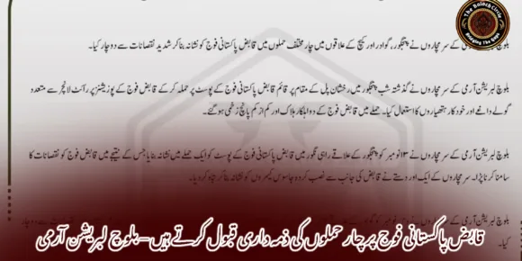پنجگور حملے میں قابض پاکستانی فوج کے چار اہلکار ہلاک – بلوچ لبریشن آرمی بلوچ لبریشن آرمی کے ترجمان جیئند بلوچ نے میڈیا کو جاری بیان میں کہا کہ ہمارے سرمچاروں نے پنجگور میں قابض