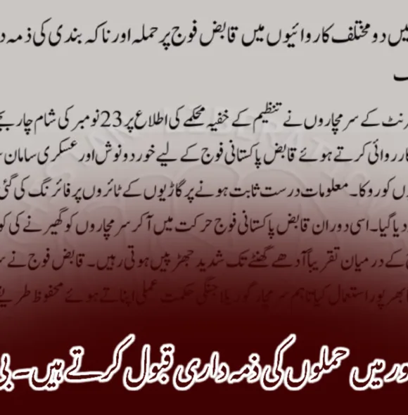 پنجگور حملے میں قابض پاکستانی فوج کے چار اہلکار ہلاک – بلوچ لبریشن آرمی بلوچ لبریشن آرمی کے ترجمان جیئند بلوچ نے میڈیا کو جاری بیان میں کہا کہ ہمارے سرمچاروں نے پنجگور میں قابض