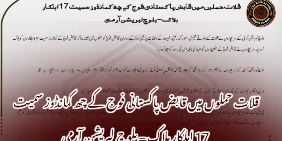 چھ حملوں میں قابض فوج کے 9 اہلکار ہلاک کئے۔ بلوچ لبریشن آرمی بلوچ لبریشن آرمی کے ترجمان جیئند بلوچ نے